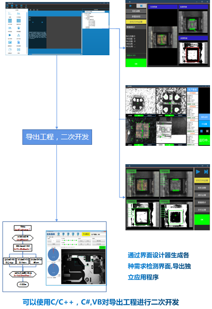 自定義檢測(cè)界面,用戶(hù)logo,圖像顯示,圖形顯示,參數(shù)控制按鈕,表格,圖表,運(yùn)行控制按鈕,統(tǒng)計(jì),界面布局,界面停靠,多界面,多界面控制按鈕,自定義顯示文字 ,界面顏色控制 ,界面字體控制,導(dǎo)出可執(zhí)行exe,導(dǎo)出C,C#方便二次開(kāi)發(fā)。支持界面控件快速擴(kuò)展。