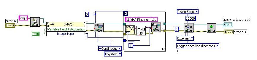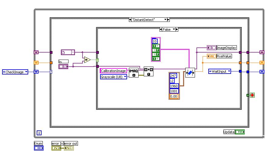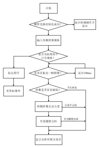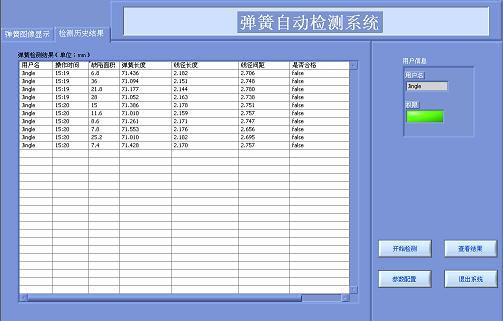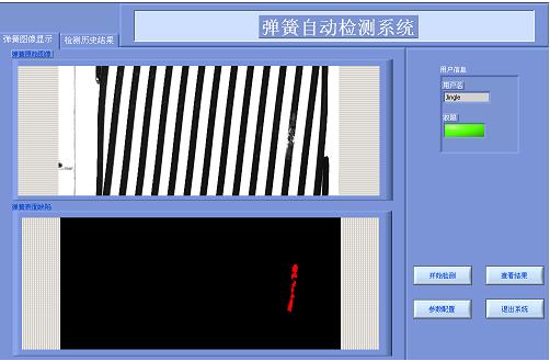 引言 彈簧表面質(zhì)量檢測(cè)是彈簧加工的重要環(huán)節(jié)。檢測(cè)時(shí),人們通過(guò)各種試驗(yàn)方法對(duì)彈簧的性能進(jìn)行測(cè)定,從而把彈簧的質(zhì)量定量數(shù)值化,為企業(yè)的質(zhì)量管理與追蹤提供正確的評(píng)定依據(jù)。彈簧的成品檢驗(yàn)主要包括對(duì)彈簧的外觀檢測(cè)、尺寸檢測(cè)、負(fù)荷檢測(cè)等內(nèi)容,這里我們主要完成對(duì)彈簧的外觀檢測(cè)和尺寸檢測(cè)(包括彈簧長(zhǎng)度、線徑、線徑間距和有效圈數(shù))。 國(guó)內(nèi)現(xiàn)有的彈簧檢測(cè)方法一般是人工用游標(biāo)卡尺等工具目測(cè),這種方法不僅效率低,而且誤差大。有些公司也從國(guó)外進(jìn)口先進(jìn)設(shè)備進(jìn)行彈簧自動(dòng)檢測(cè),這一方面大大增加了生產(chǎn)成本,另一方面設(shè)備的維護(hù)也很困難。針對(duì)以上不足,自主開(kāi)發(fā)基于機(jī)器視覺(jué)的彈簧自動(dòng)檢測(cè)系統(tǒng)具有十分重要的意義。該系統(tǒng)主要基于NI公司的LabVIEW圖形編程環(huán)境進(jìn)行開(kāi)發(fā),界面簡(jiǎn)潔友好,方便檢測(cè)人員操作。對(duì)于同一規(guī)格的彈簧,系統(tǒng)在得到彈簧的所有數(shù)據(jù)后與對(duì)應(yīng)標(biāo)準(zhǔn)值進(jìn)行比對(duì),對(duì)彈簧進(jìn)行分類(lèi)。實(shí)驗(yàn)結(jié)果表明,相比傳統(tǒng)的人工檢測(cè)方法,該方法檢測(cè)速度快,精度更高,可靠性更強(qiáng)。 一. 彈簧檢測(cè)平臺(tái)硬件構(gòu)成 1.1檢測(cè)系統(tǒng)的組成部分 彈簧自動(dòng)檢測(cè)系統(tǒng)的硬件構(gòu)成如圖1所示,彈簧水平置于白色旋轉(zhuǎn)軸上,由步進(jìn)馬達(dá)驅(qū)動(dòng)軸轉(zhuǎn)動(dòng)。PLC除了負(fù)責(zé)發(fā)出脈沖驅(qū)動(dòng)馬達(dá)旋轉(zhuǎn)外,也將此脈沖作為外部觸發(fā)信號(hào)接入圖像采集卡,以保證采集到等比例的圖像。相機(jī)采用德國(guó)Basler公司的線陣相機(jī)系列Basler L101k-2k,配合NI公司的PCI-1428圖像采集卡一起完成圖像的采集工作。采集的彈簧展開(kāi)圖如圖1所示。相機(jī)采集完一幀彈簧的展開(kāi)圖后,經(jīng)圖像采集卡送入計(jì)算機(jī)進(jìn)行處理。計(jì)算機(jī)主要完成硬件的配置及初始化、圖像處理、數(shù)據(jù)分析與保存等功能。經(jīng)圖像處理得到彈簧表面缺陷和尺寸的關(guān)鍵參數(shù)后,計(jì)算機(jī)將其與對(duì)應(yīng)規(guī)格的彈簧標(biāo)準(zhǔn)庫(kù)信息進(jìn)行比對(duì),以標(biāo)識(shí)不合格彈簧。 圖 1 彈簧自動(dòng)檢測(cè)系統(tǒng)示意圖 1.2線陣相機(jī)與采集卡的配合 線陣相機(jī)的取像原理與面陣不同,它每次只采集一行圖像,只有在鏡頭與被拍攝物體之間存在相對(duì)運(yùn)動(dòng)時(shí)才能采完一幀完整的二維影像。圖2中,縱向?yàn)榫陣傳感器的方向,其分辨率由線陣CCD決定;橫向表示相機(jī)的掃描方向,其分辨率由步進(jìn)電機(jī)的最小步距決定。電機(jī)運(yùn)動(dòng)速度過(guò)大,圖像會(huì)被壓縮,如圖2(b)所示;速度太小,圖像則會(huì)被拉伸,如圖2(c)。 圖 2 運(yùn)動(dòng)速度不同時(shí)的對(duì)應(yīng)成像效果 為了得到等比例的圖像,設(shè)置相機(jī)工作于外部邊沿觸發(fā)模式,如圖3。在這種模式下,相機(jī)的線掃率完全由外部信號(hào)的頻率決定,兩者關(guān)系公式:線掃率=1/外部信號(hào)頻率。NI公司的PCI-1428圖像采集卡提供了四對(duì)外部觸發(fā)端口(分別從Trig_(0)到Trig_(3),輸入信號(hào)類(lèi)型為T(mén)TL電平),支持線陣相機(jī)的外同步取像模式。將PLC發(fā)出的脈沖接入PCI-1428采集卡的任一外部觸發(fā)端口,這樣就實(shí)現(xiàn)了馬達(dá)轉(zhuǎn)速與線掃率之間的對(duì)應(yīng)。MAX(Measurement & Automation Explorer)是NI公司開(kāi)發(fā)出來(lái)方便用戶(hù)對(duì)各種硬件進(jìn)行設(shè)置和測(cè)試的軟件。在MAX中,可以根據(jù)需要配置采集卡的基本參數(shù),如取像模式,圖像大小,觸發(fā)信號(hào)的類(lèi)型等。 圖 3 外部邊沿觸發(fā)模式(ExSync,Edged-controlled Mode) 二. 彈簧檢測(cè)部分的關(guān)鍵模塊 彈簧自動(dòng)檢測(cè)系統(tǒng)的軟件部分采用NI公司的LabVIEW圖形編程語(yǔ)言開(kāi)發(fā)。LabVIEW直觀的圖標(biāo)操作、高效的多線程并行處理以及方便的模塊化特性使得程序的開(kāi)發(fā)周期大大縮短,程序執(zhí)行效率高且擴(kuò)展能力強(qiáng),便于隨時(shí)查錯(cuò)和修改。彈簧檢測(cè)部分的流程如圖4所示,程序主要由幾個(gè)功能模塊組成:彈簧標(biāo)準(zhǔn)庫(kù)更新、圖像采集、圖像處理以及數(shù)據(jù)分析處理模塊。 圖 4 圖像處理主程序流程 2.1 彈簧標(biāo)準(zhǔn)庫(kù) 在本系統(tǒng)中,彈簧的規(guī)格是以彈簧的外徑尺寸來(lái)區(qū)分的。彈簧標(biāo)準(zhǔn)庫(kù)中包含兩類(lèi)信息:不同規(guī)格彈簧的標(biāo)定信息和對(duì)應(yīng)的標(biāo)準(zhǔn)尺寸。相機(jī)位置固定后,圖像X方向單位象素表示的實(shí)際尺寸是不變的,而Y方向的實(shí)際尺寸△Li與彈簧外徑成正比。因此,我們需要事先知道△Li,才能得到彈簧的實(shí)際尺寸值。由于標(biāo)準(zhǔn)庫(kù)不可能已經(jīng)包含所有規(guī)格彈簧的信息,系統(tǒng)還添加了標(biāo)準(zhǔn)庫(kù)的擴(kuò)展功能,檢測(cè)人員可以隨時(s
