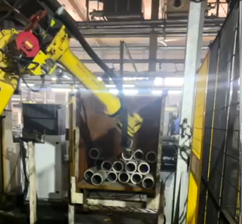 毛刺套3D視覺系統定位系統采用3D結構光相機實時定位缸套姿態,然后控制機器人將缸套從料框中抓取到產線上進行加工。該系統可以根據周邊設備干涉及產品姿態實現自動避障, 選擇時間最短或距離最優的路徑,自動規劃抓取以及從料框退出的軌跡。